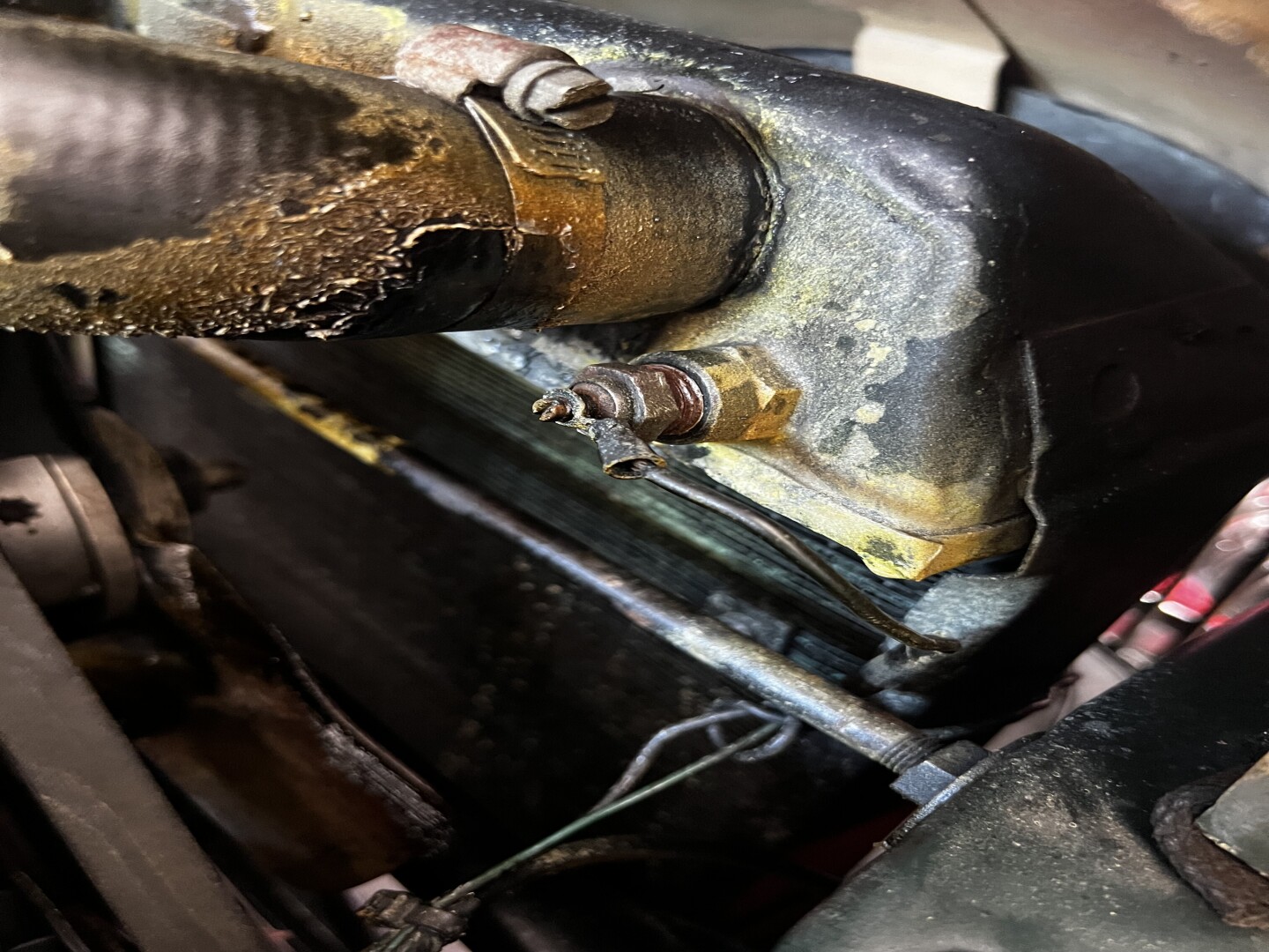 Your fan switch should be installed in the radiator (and that thing looks tired. Good thing you have a nice shiny new one. The top is the return, the hot portion, so putting it there is certainly OK. The bottom works as well (for the record, most of my radiators have the thermostatic switch at the bottom). All we are doing is getting the fan to turn on and create the airflow that will promote cooling at low speeds. I don't know where your rad's bungs are located, but it really doesn't matter much. Just pic a hole and put the switch there.